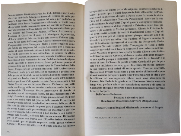 Tash në po të njëjtën provincë të urdhrit tim të të shenjtës Kongregatë, edhe unë do të filloj robërinë hyjnore duke ushtruar Misionin e Shenjtë në Janjevë dhe në administratën e Prishtinës dhe të Vuçitërnës pasi fillimisht kam qenë student i zellshëm për dymbëdhjetë vjet i më të shquarit Kardinal Gregorio Barbarigo, Peshkop i Padovës, dhe në fund edhe i së lartës Kongregatë të Shejtë në Kolegjin e Propagandës. Me ardhjen time në këtë vend, jo vetëm kuptova analfabetizmin e mjerueshëm të këtyre anëve të mia, por edhe se që të gjithë u vranë, kur fatkeqësisht ndodhi që vetë Serbia të kthehej nën zgjedhën e saj osmane, dhe atë me barbarinë më të madhe; ndërsa vëllai im abati Gjon Bogdani, një nxënës i Loretos, u pre në copa të vogla i gjallë, dhe i akuzuari im ungj, i cili ishte gjetur tashmë i vdekur dhe i varrosur, megjithatë u nxor nga varri dhe u dha si vakt dhe ushqim për qentë në mes të tregut të Prishtinës me mitër1 në kokë. Por përtej kësaj gjithçka që më përkiste mua i gjeta fatkeqësisht të uzurpuara nga barbarët, si shtëpinë, ashtu edhe vreshtat e pasurinë bashkë me të gjitha mallrat e mundshme, duke qenë tani duarthatë besoj dhe kam shpresë vetëm në providencën e Madhërisë së Tij Hyjnore dhe në mbrojtjen më të mirë të Kongregatës së Shenjtë me anë të më të vlefshmeve, përmes ndihmës së Shkëlqesisë suaj.