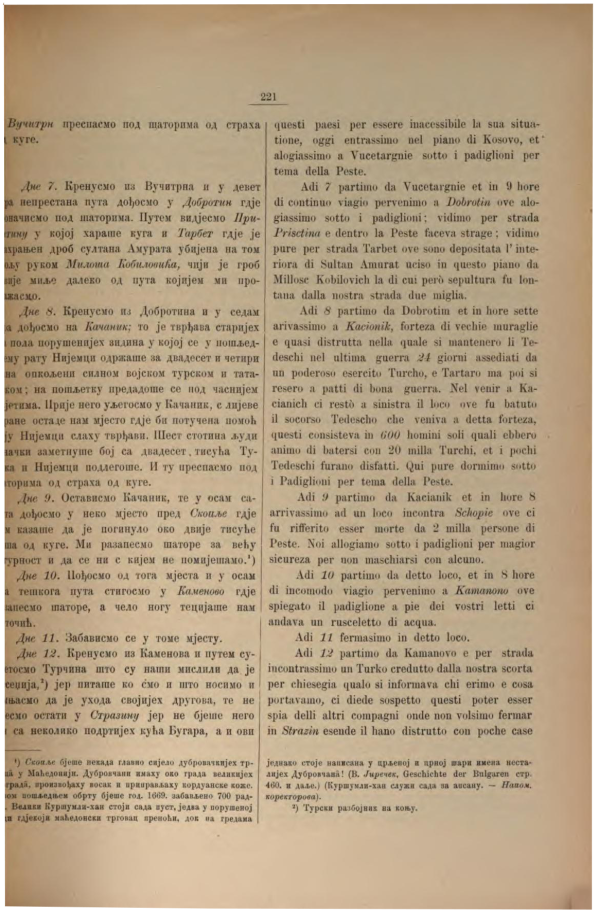 Në datën 7 u larguam nga Vushtria dhe pas 9 orë udhëtimi të vazhdueshëm arritëm në Dobrotin ku u vendosëm në tenda: prej rrugës pamë Prishtinën ku murtaja po bënte kërdinë; pamë edhe Tarbetin (tyrben) ku ishin depozituar të brendshmet e Sulltan Amuratit, të vrarë në këtë anë nga Millose Kobilovich, por varri i të cilit ishte dy milje larg nga rruga jonë.