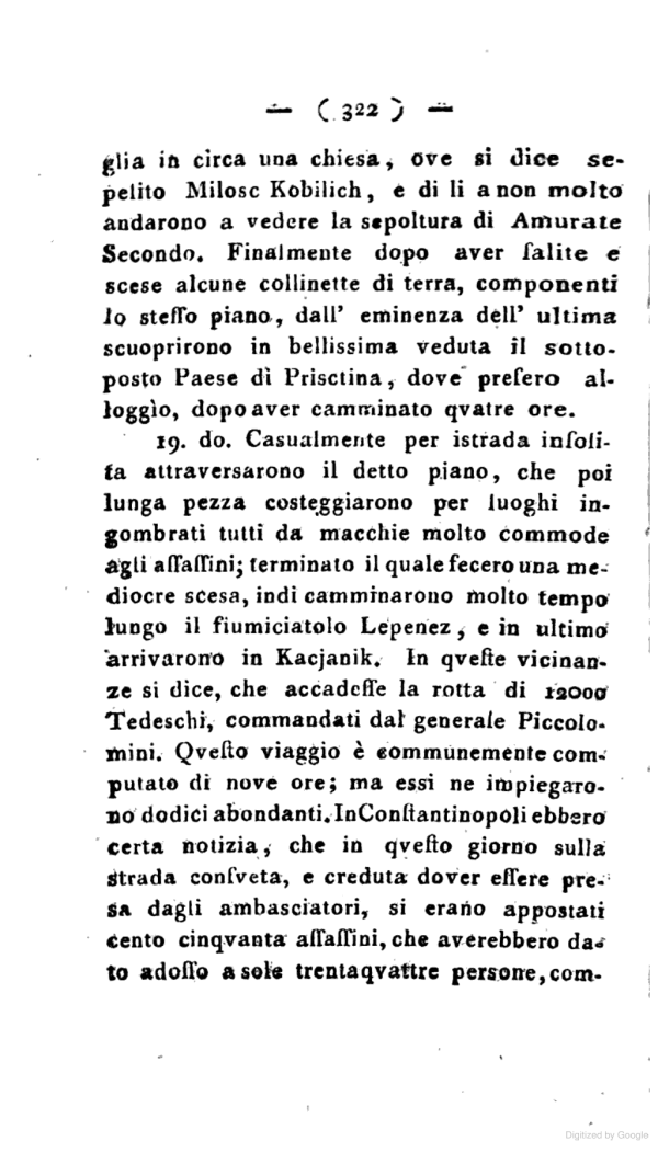 Datë 18 [maj]. Duke ecur për një kohë të gjatë përgjatë kësaj fushe, kaluam lumin Lab, ose Lau, dhe pamë në të majtë, rreth tre milje larg, një kishë ku thuhet se ishte varrosur Millose Kobilich, dhe pak më tej pamë edhe varrin e Amuratit të Dytë. Më në fund, pasi ngjitëm dhe zbritëm disa kodra, të madhësisë së njëjtë, nga maja e kodrës së fundit zbuluam një pamje të bukur të qytetit të Prishtinës në rrëzë kodre, ku u vendosëm, pasi kishim ecur për katër orë.