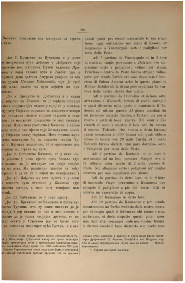 Sedmog smo napustili Vučitrn i posle 9 sati neprekidnog putovanja stigli u Dobrot gde smo se smestili u šatore: sa puta smo videli Prištinu gde je kuga pustošila; videli smo i Tarbet (mauzolej) gde su deponovane utrobe sultana Amurata, koga je sa ove strane ubio Milose Kobilović, ali čiji je grob bio dve milje od našeg puta.