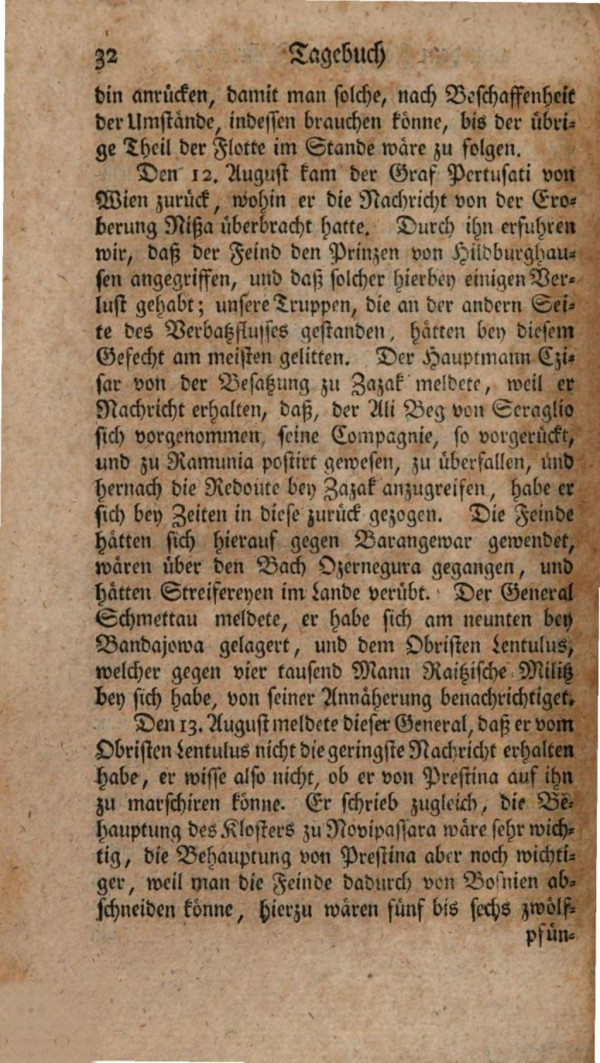 Dana 13. avgusta ovaj general [Schmettau] je izvestio da nije primio ni najmanje vesti od pukovnika Lentula, tako da ne zna da li može da krene u njegovom pravcu iz Prištine. Istovremeno je pisao da bi sticanje manastira u Novipazaru bilo veoma važno, ali bi sticanje Prištine bilo još važnije jer bi to omogućilo neprijatelju da se otcepi od Bosne; za to bi bilo potrebno pet do šest dvanaestofutara i tri hiljade pešaka. Feldmaršal Hevenhiler je iz svog logora kod Bregove javio da će pozvati komandanta u Vidin. Stiglo je pismo od pukovnika Lentula u kojem su tražili municiju, lekove i lekare.