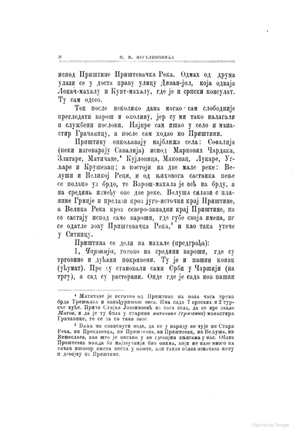 1, Carshia, skoro u centru grada, gde se odvija trgovina i gde se nalaze natkrivene prodavnice. Tu je i pašina konak (Hidžimeti). Ranije su ga naseljavali samo Srbi, čaršije (na pijaci), sada su proterani. Tamo gde se nalazi novi pašin dvor do sahat-kule, nekada su bile zidine stare palate cara Milutina, stara Priština, tako je pisao g. M. S. Milojević u svom putopisu. Ove zidine je video pre 25 godina, ali od njih nema tragova, jer je na tim zidinama pre osam godina podignut pašin konak. Hadži-Vitko mi je pričao da su Turci, pre nego što su zazidali pašin dvor, kod starih zidina cara Milutina, iskopali i našli dva mala sanduka od gvožđa ili bakra, i da su u njima bile neke karte i knjige. Da su te knjige i [te] karte bile nevažne, možda ih Turci ne bi poslali čak do Istanbula.