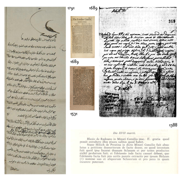 U ovoj rubrici predstavljamo neke od glavnih dokumentarnih materijala koji spominju ili opisuju grad Prištinu do XIX. vek. Dokumenti potječu iz raznih arhiva, uključujući dubrovačke (dubrovačke), srpske, osmanske, mletačke, rumunjske i austrijske. Neki od dokumenata pripadaju albanskim likovima tog vremena, poput onih iz obitelji Bogdani, Tomë Raspasani ili dva iz Samija Frashërija u stoljeću. XIX. Sljedeći popis nije iscrpan, ali postoje i drugi dokumenti koji bi se mogli pojaviti u budućnosti. Oni koji se objavljuju uglavnom su dokumenti koji su ranije objavljeni na drugim jezicima, a koji još nisu prevedeni na albanski. U onim slučajevima u kojima smo pronašli prijevode na albanski, uputili smo ih u skladu s tim. Tu su i neki nepoznati, dosad neobjavljeni materijali. Neki također potječu iz Arhiva Prištine, digitaliziranog fonda osmanskih dokumenata koji su nedavno doneseni; a neki drugi prikazani su kao fragmenti iz raznih knjiga tiskanog vremena koje govore o Prištini, ali koje u mnogim slučajevima nisu prevedene na albanski.