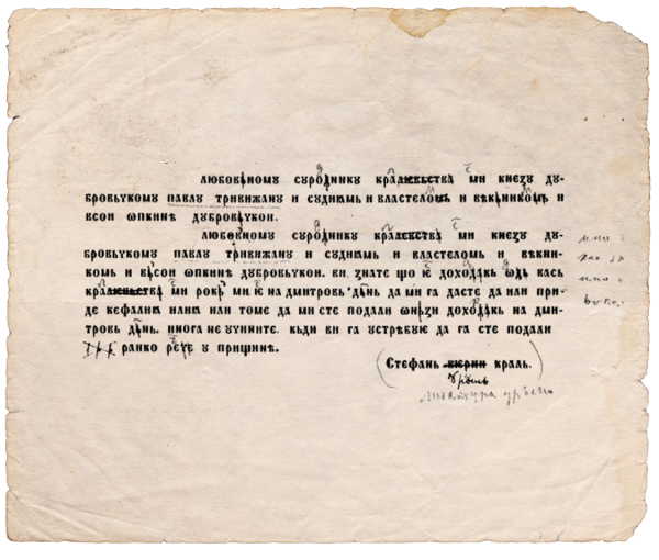 [Priština, oktobar 1325.] Stefan Uroši, srpski kralj, naredio je Dubrovčanima da dođu [u Prištinu] i plate obaveze Svetog Dimtrija preko Ilije ili Tomaša, oba Kefalijana.