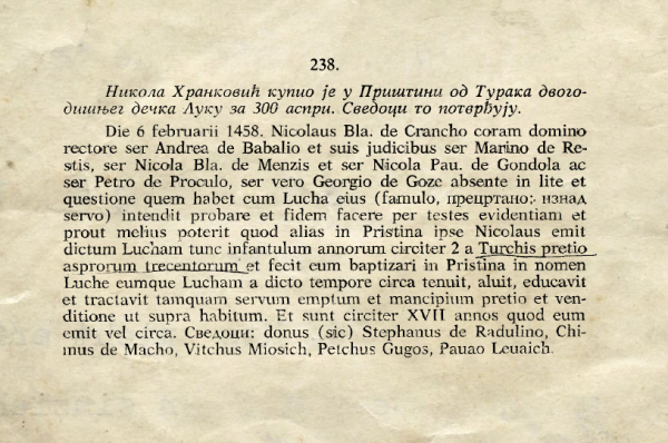 Dana 6. februara 1458. Nikolas Bla.[nchus?] de Crancho pred velečasnim rektorom, gospodinom Andreom de Babaliom, i njegovim sudijama, gospodinom Marinom de Restisom, gospodinom Nicola Bla.[nchus?] de Menzisom, i gospodinom Nikolasom Pauom.[ lo] de Gondola i gospodinom Pitera de Prokula, dok je gospodin Džordž de Goze bio odsutan u tužbi i sporu koji ima sa Lukom, njegovim slugom, [u čemu] namerava da dokaže i stavi do znanja preko svedoka što je bolje moguće; [da je] na drugoj strani u Prištini sam Nikola kupio ovog Luku od Turaka kada je on bio dete od oko 2 godine, po ceni od tri stotine sukna, a posle krštenja u Prištini sa imenom Luka, zadržao je tog Luku, nahranio ga, podigao i tretirao ga kao kupljenog roba i roba po ceni i prodaji kao gore. I prošlo je oko 17 godina otkako ga je kupio, ili otprilike. Svedoci: Don Stephanus de Radulinus, Chiinus de Macho, Vitchus Miosich, Petchus Gugos, Pauao Leuaich.